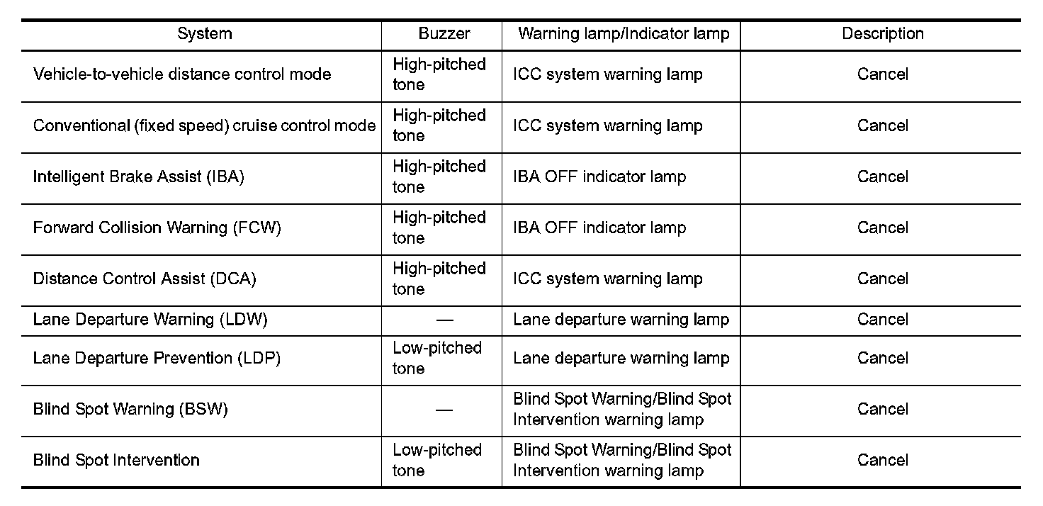 If a malfunction occurs in each system, ADAS control unit cancels each control, sounds a beep, and turns ON