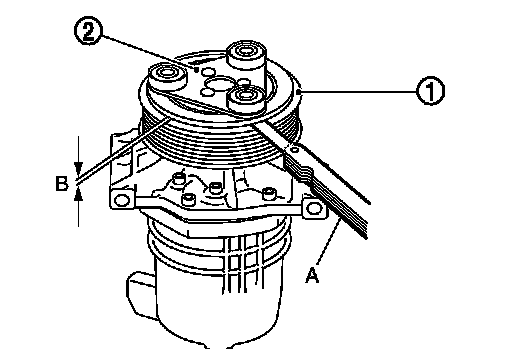 Check the clearance (B) between pulley assembly (1) and clutch disc (2) along the entire periphery with a feeler gauge (A).