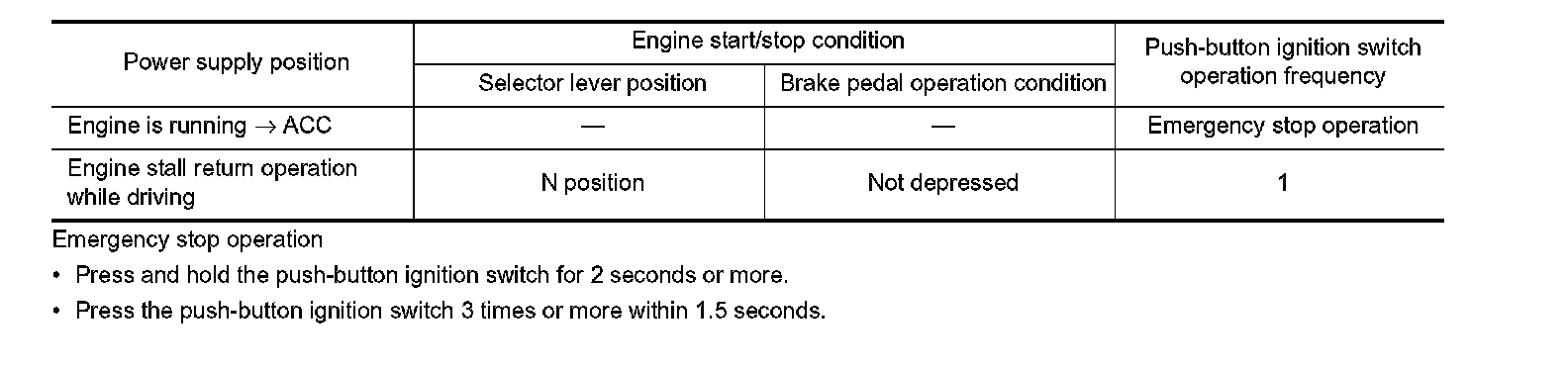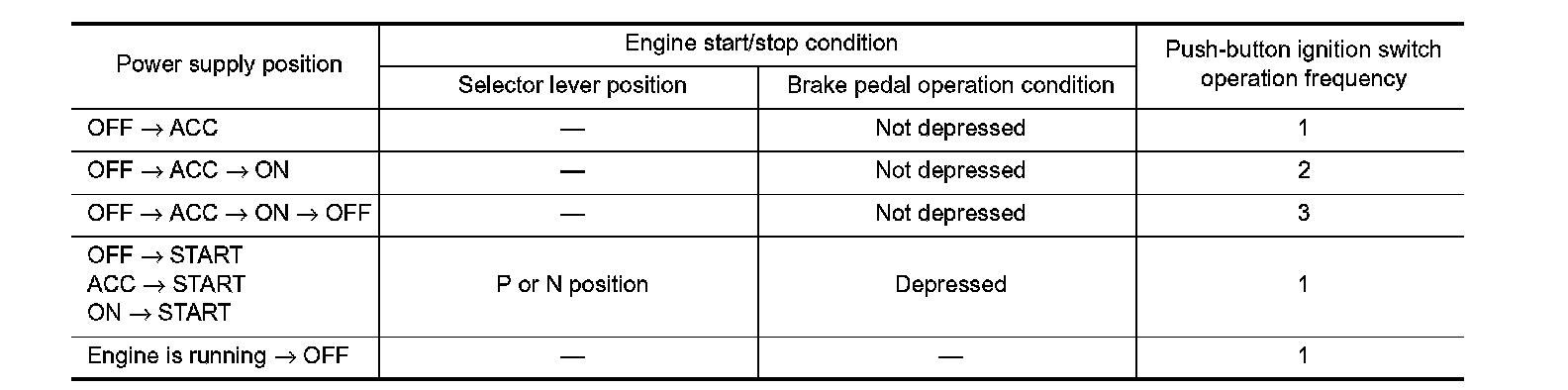 POWER SUPPLY POSITION CHANGE TABLE BY PUSH-BUTTON IGNITION SWITCH OPERATION