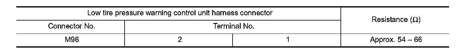 2.Check the resistance between the low tire pressure warning control unit harness connector terminals.
