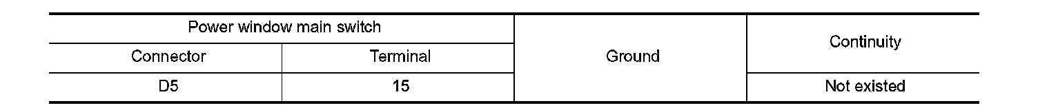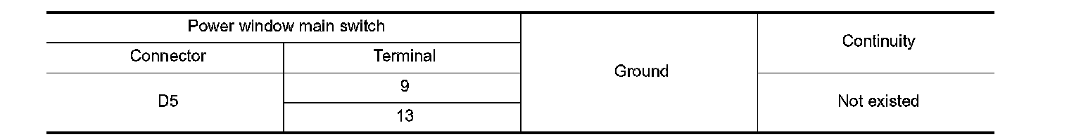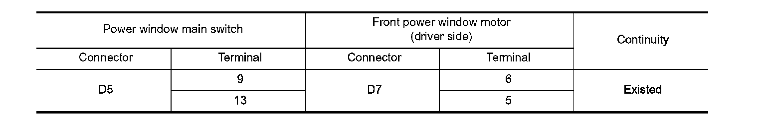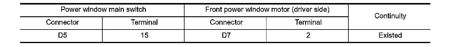 2.Check continuity between power window main switch harness connector and front power window motor (driver side) harness connector.