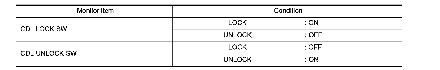 Check ("CDL LOCK SW ", "CDL UNLOCK SW") in "DATA MONITOR" mode for "POWER DOOR LOCK SYSTEM" with CONSULT. CONSULT Function.
