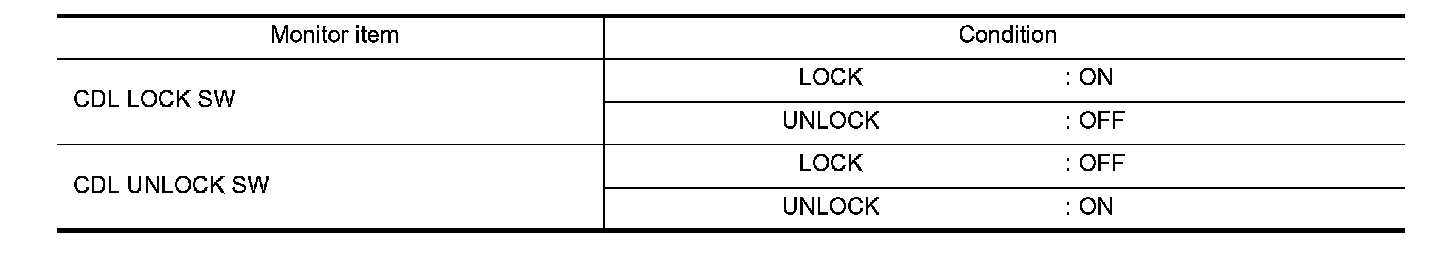 Check ("CDL LOCK SW ", "CDL UNLOCK SW") in "DATA MONITOR" mode for "POWER DOOR LOCK SYSTEM" with CONSULT. CONSULT Function.