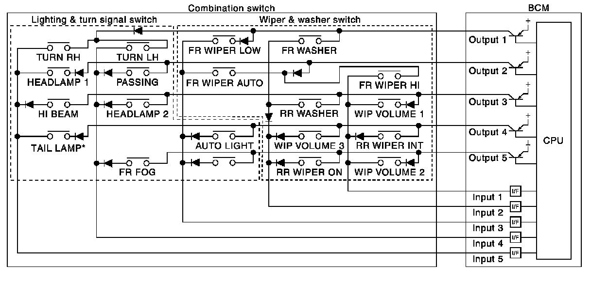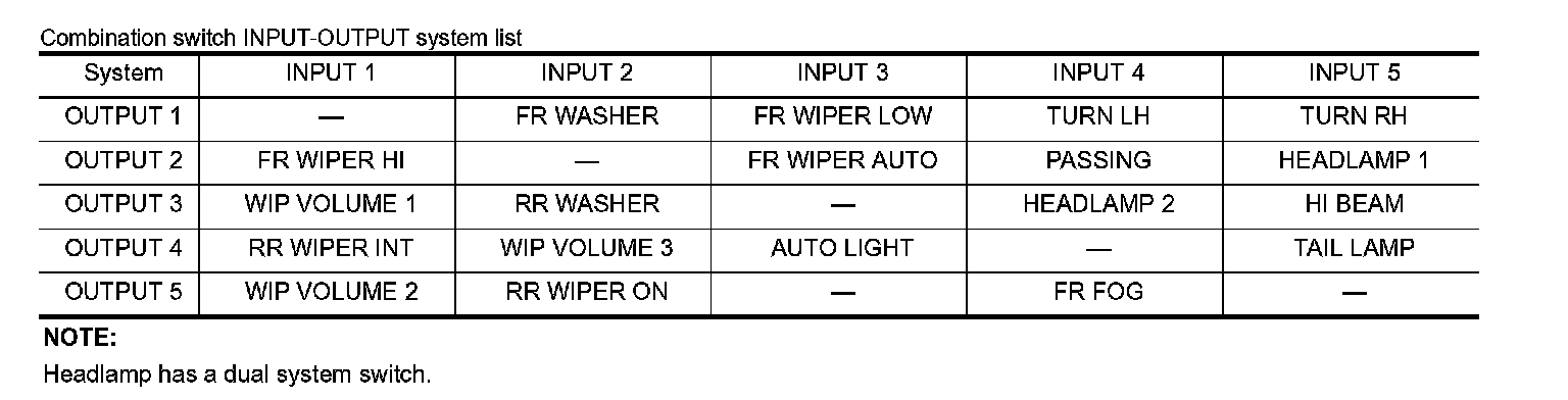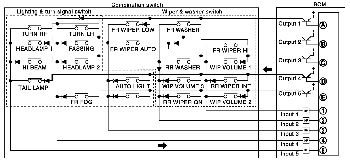 - BCM detects the combination switch status signal "5AD" when the signals of OUTPUT 1 and OUTPUT 4 are input to INPUT 5.