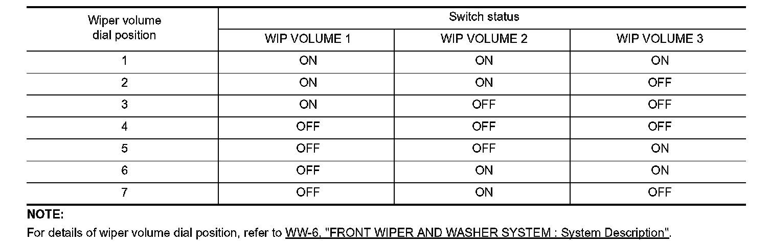 BCM judges the wiper volume dial 1 - 7 by the status of WIP VOLUME 1, 2 and 3 switches.