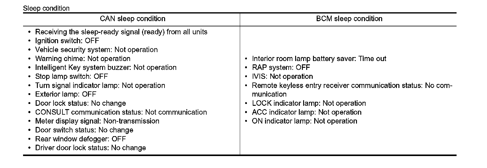 - BCM transmits the sleep wake up signal (sleep) to each unit when all of the CAN sleep conditions are fulfilled.