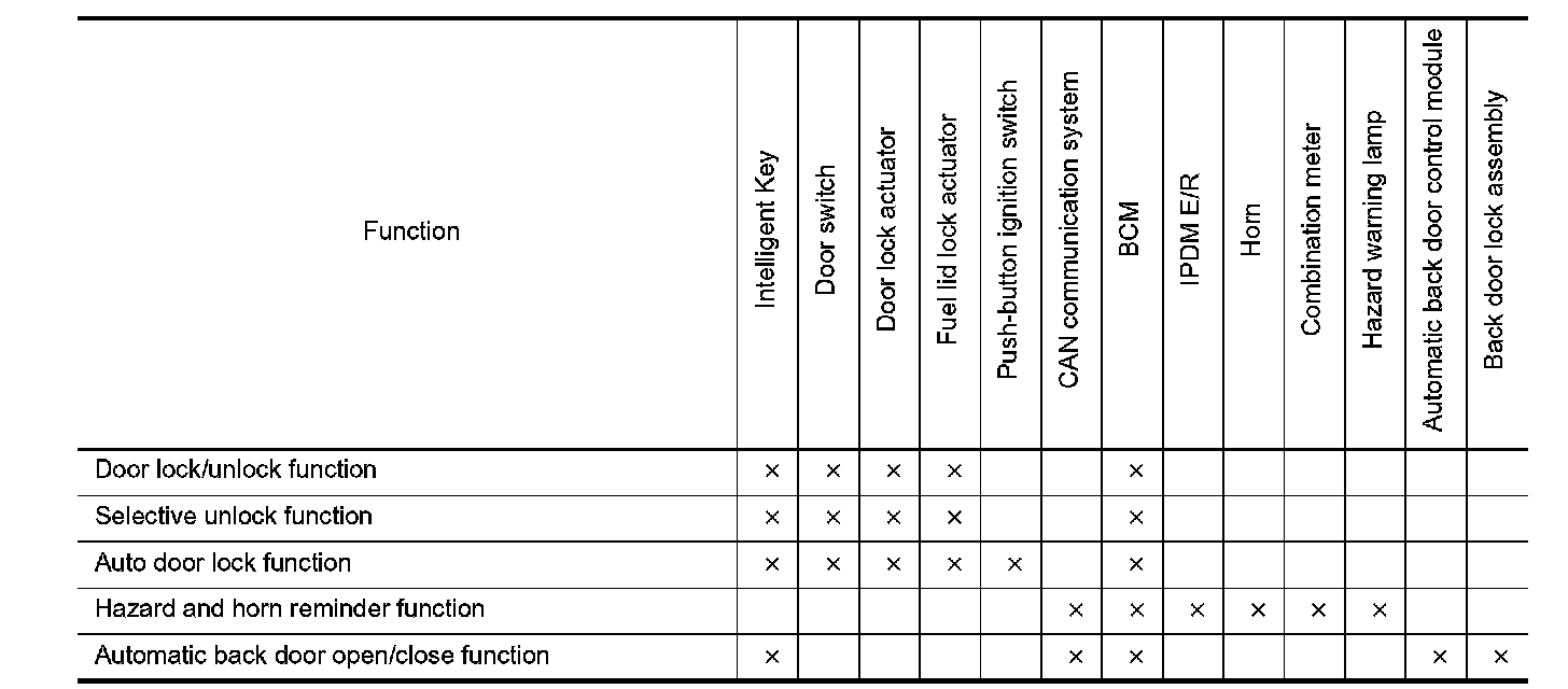 - When BCM receives the door lock/unlock signal, it operates all door lock actuators and fuel lid lock actuator, blinks the hazard lamp (lock: 2 time, unlock: 1 times) and horn chirp signal to IPDM E/R at the same time as a reminder.
