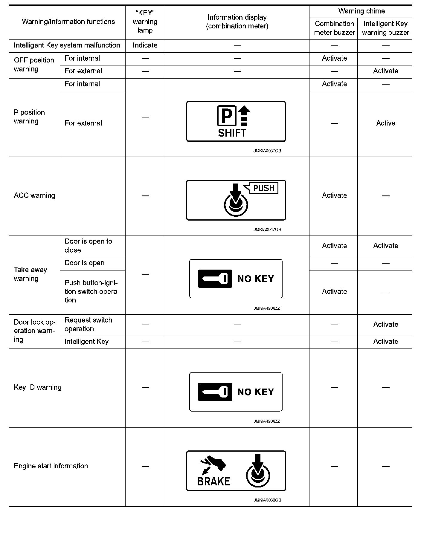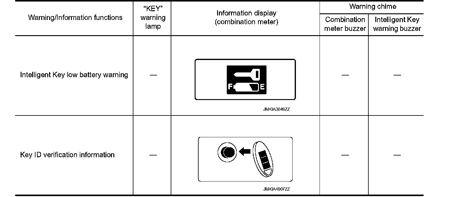 The warning function are as per the following items and are given to the user as warning information and warnings using combinations of Intelligent Key warning buzzer, combination meter buzzer, KEY warning lamp and information display in combination meter.
