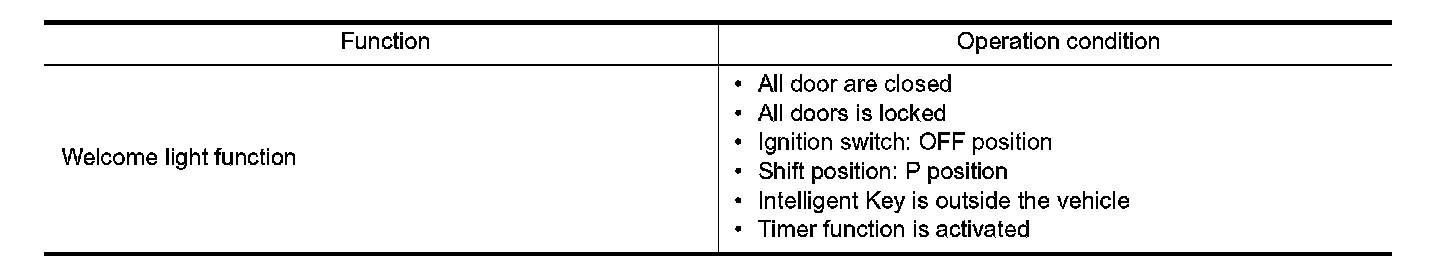 BCM can operate welcome light function, using the timer function, for 9 days, after key switch is turned OFF.