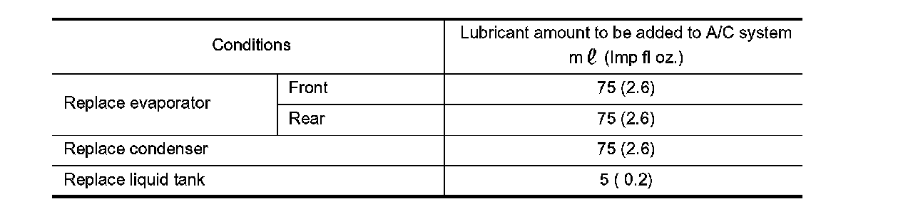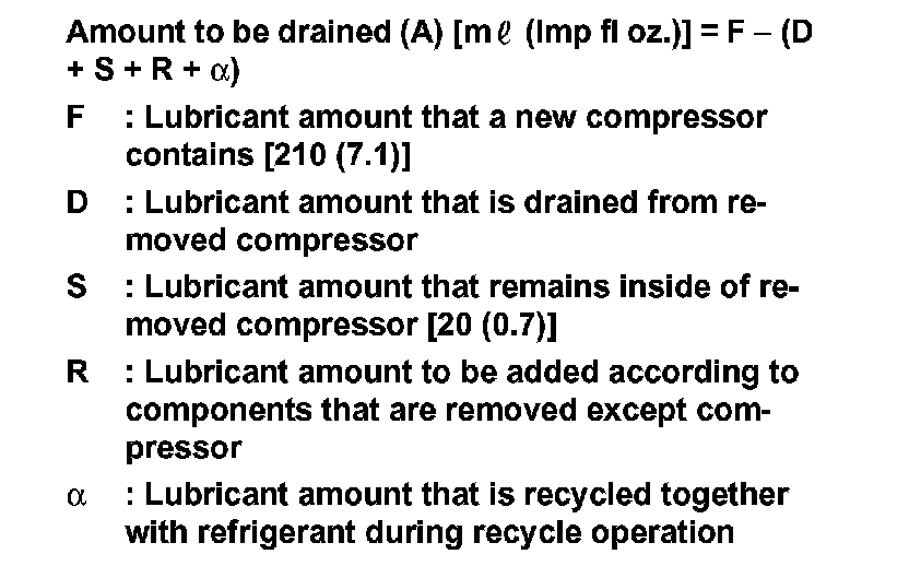 If lubricant amount that is drained from removed compressor is less than 60 m (2.1 Imp fl oz.), perform calculation by setting "D" as 40 m (1.4 Imp fl oz.).