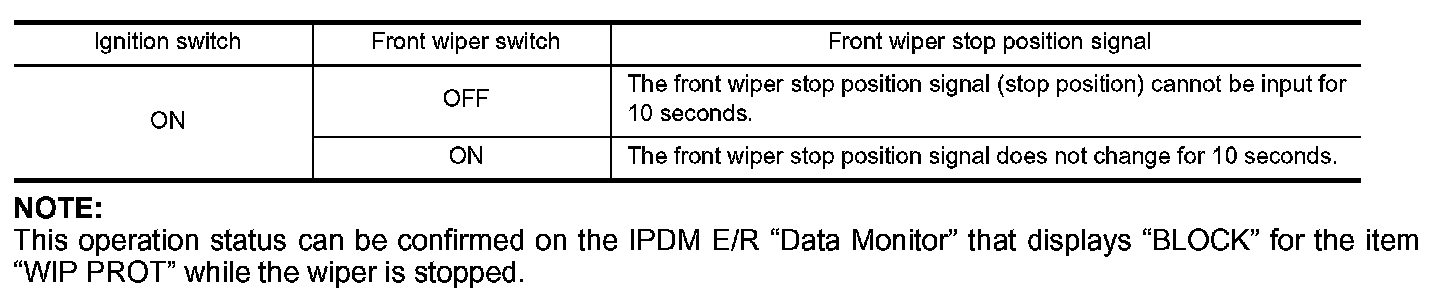 When a front wiper stop position signal is in the conditions listed below, IPDM E/R stops power supply to wiper after repeating a front wiper 10 seconds activation and 20 seconds stop.