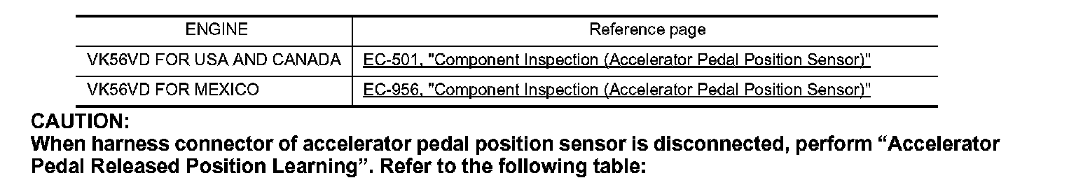 - For the electrical inspection of accelerator pedal position sensor, refer to the following table: