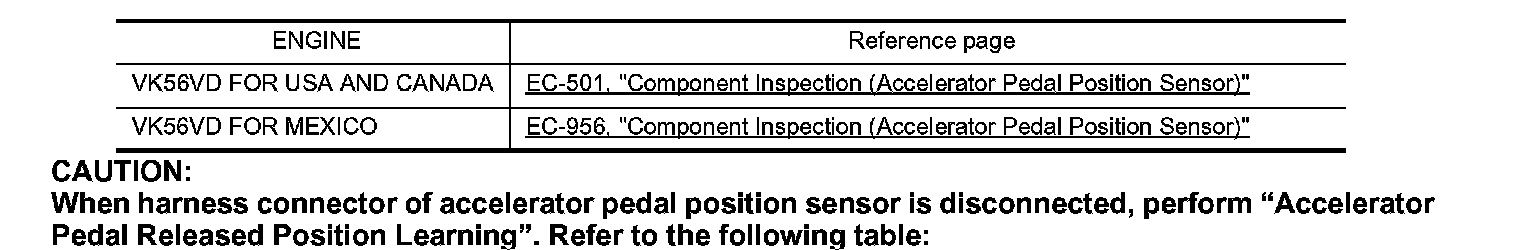 - For the electrical inspection of accelerator pedal position sensor, refer to the following table: