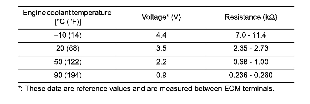 The engine coolant temperature (ECT) sensor is used to detect the engine coolant temperature. The sensor modifies a voltage signal from the ECM. The modified signal returns to the ECM as the engine coolant temperature input. The sensor uses a thermistor which is sensitive to the change in temperature. The electrical resistance of the thermistor decreases as temperature increases.