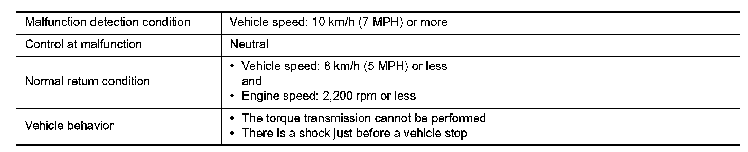 Intercepts the torque transmission and shift to the neutral status if the selector lever is shifted to "R" position while the vehicle moves forward at the vehicle speed 10 km/h (7 MPH) or more.