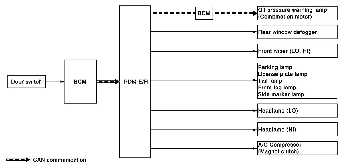 - IPDM E/R starts the auto active test with the door switch signals transmitted by BCM via CAN communication. Therefore, the CAN communication line between IPDM E/R and BCM is considered normal if the auto active test starts successfully.
