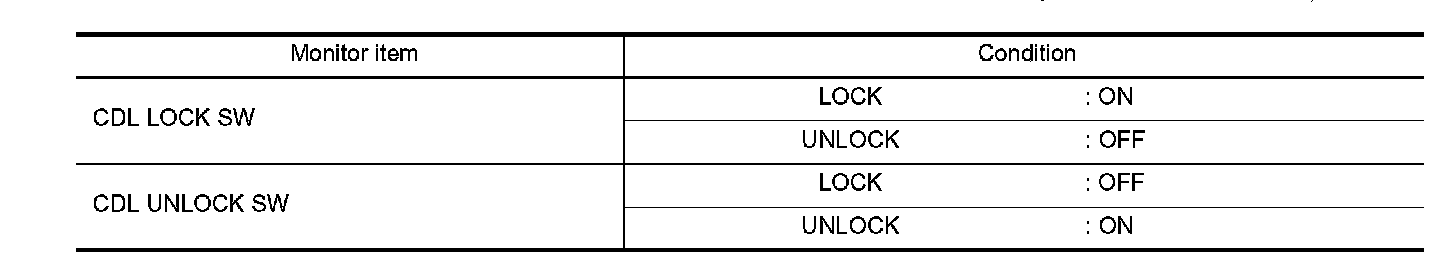 Check ("CDL LOCK SW ", "CDL UNLOCK SW") in "DATA MONITOR" mode for "POWER DOOR LOCK SYSTEM" with CONSULT. CONSULT Function.