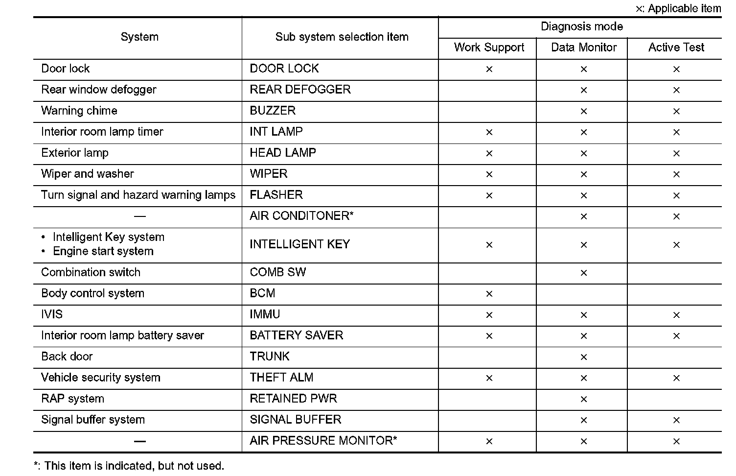 It can perform the diagnosis modes except the following for all sub system selection items.