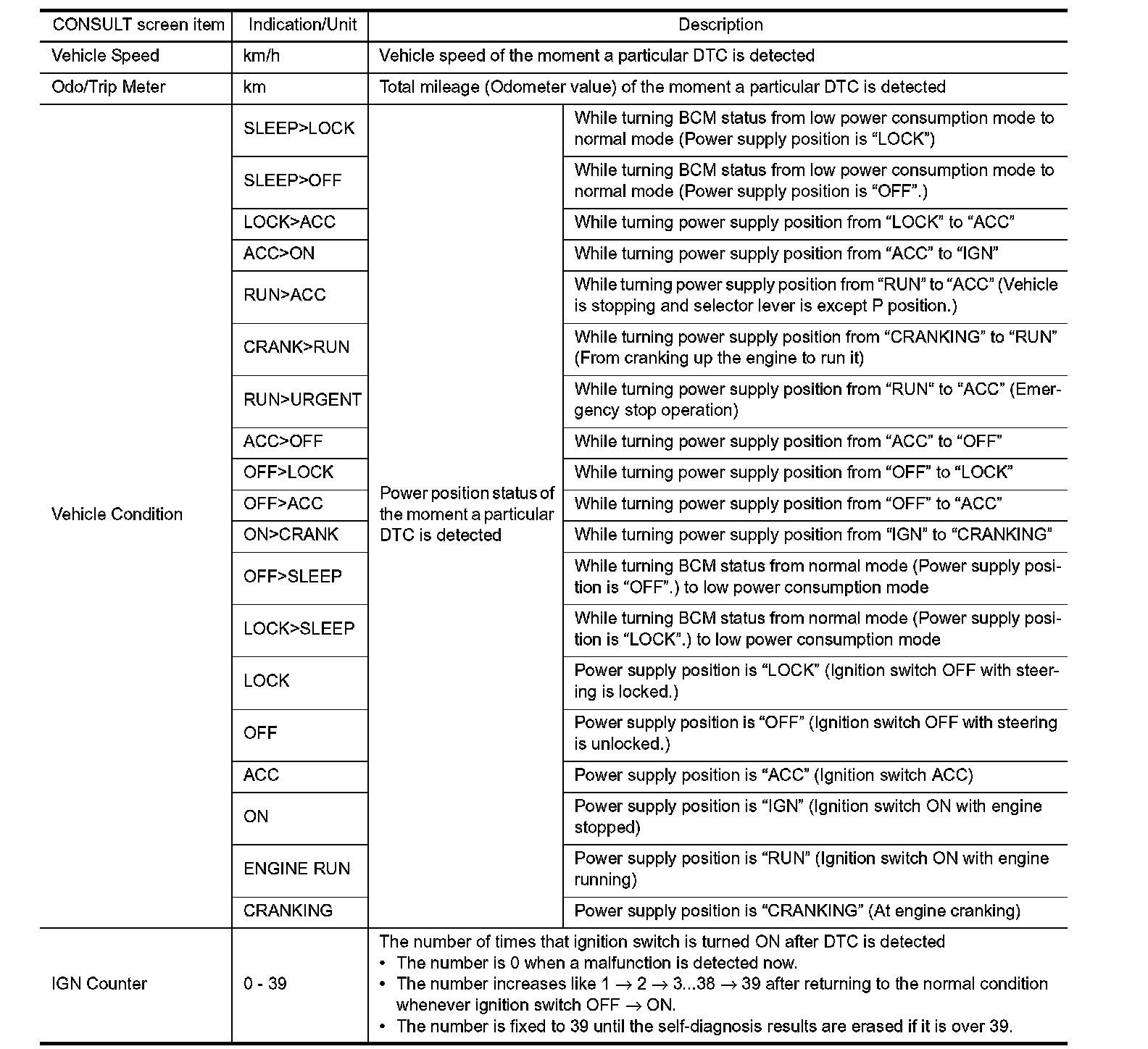 The BCM records the following vehicle condition at the time a particular DTC is detected, and displays on