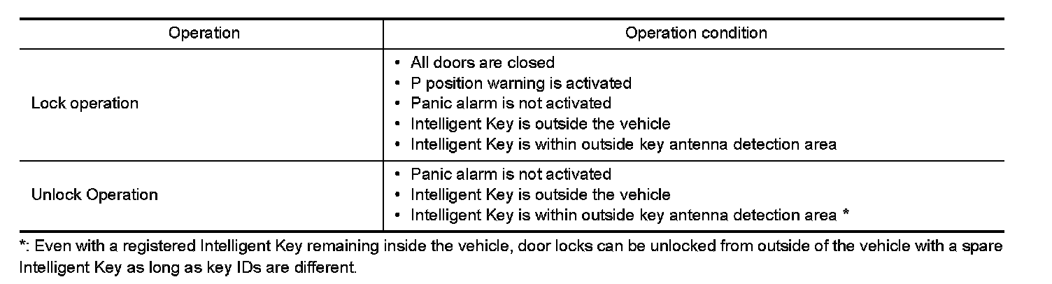 When all doors are locked, ignition switch is in OFF position and key switch is OFF (Intelligent Key is not inserted in key slot), doors are unlocked with door request switch