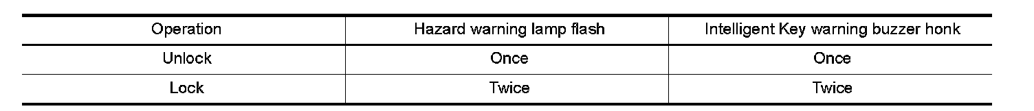 During lock, unlock, operation by each request switch, the hazard warning lamps and Intelligent Key warning buzzer will blink or honk as a reminder.