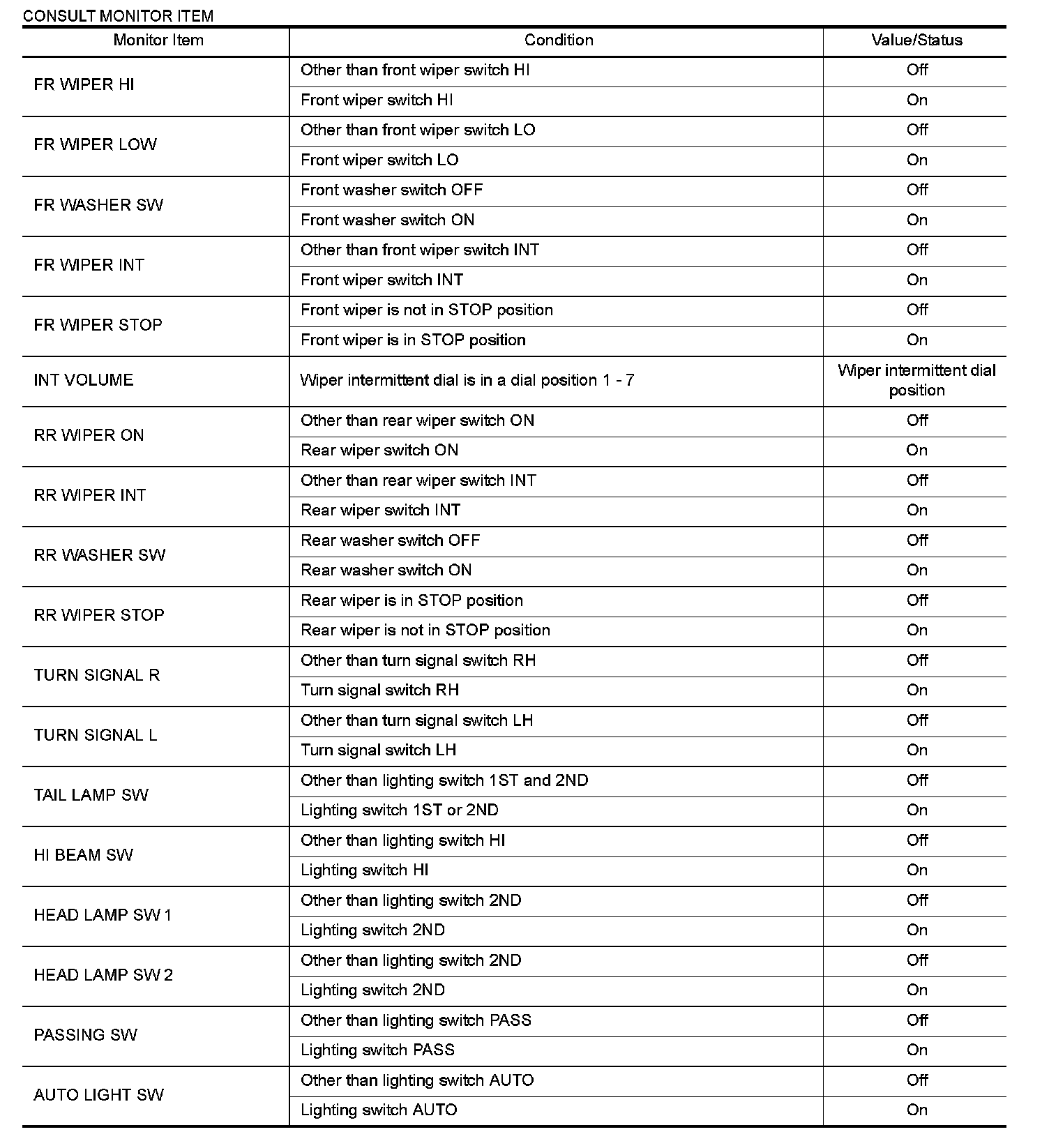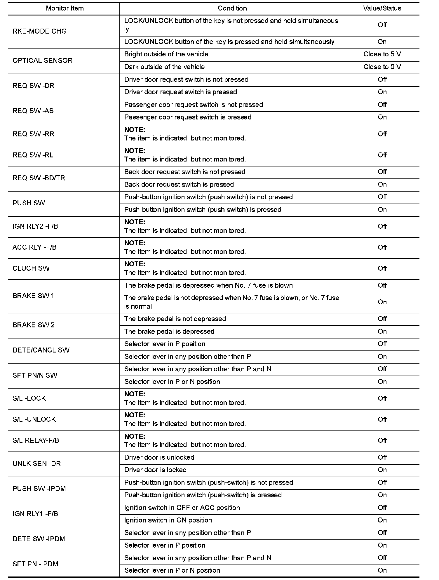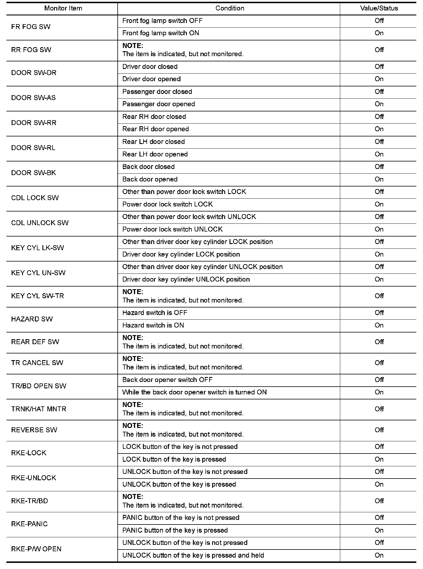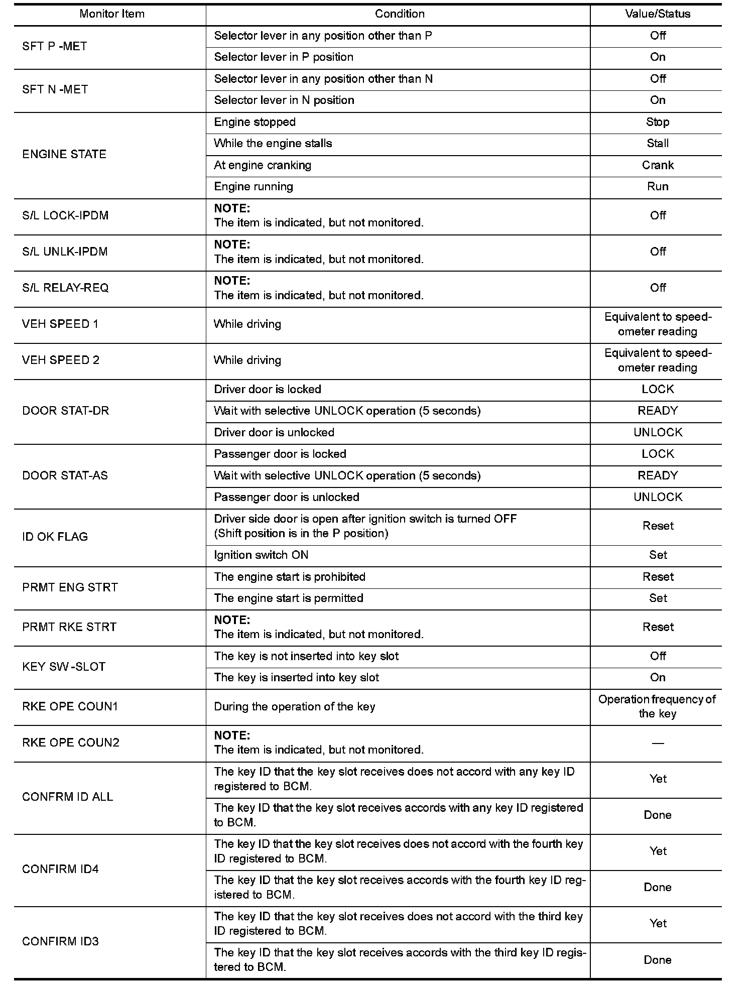 BCM (BODY CONTROL MODULE)Reference Value VALUES ON THE DIAGNOSIS TOOL NOTE: The following table includes information (items) inapplicable to this vehicle. For information (items) applicable to this vehicle, refer to CONSULT display items.