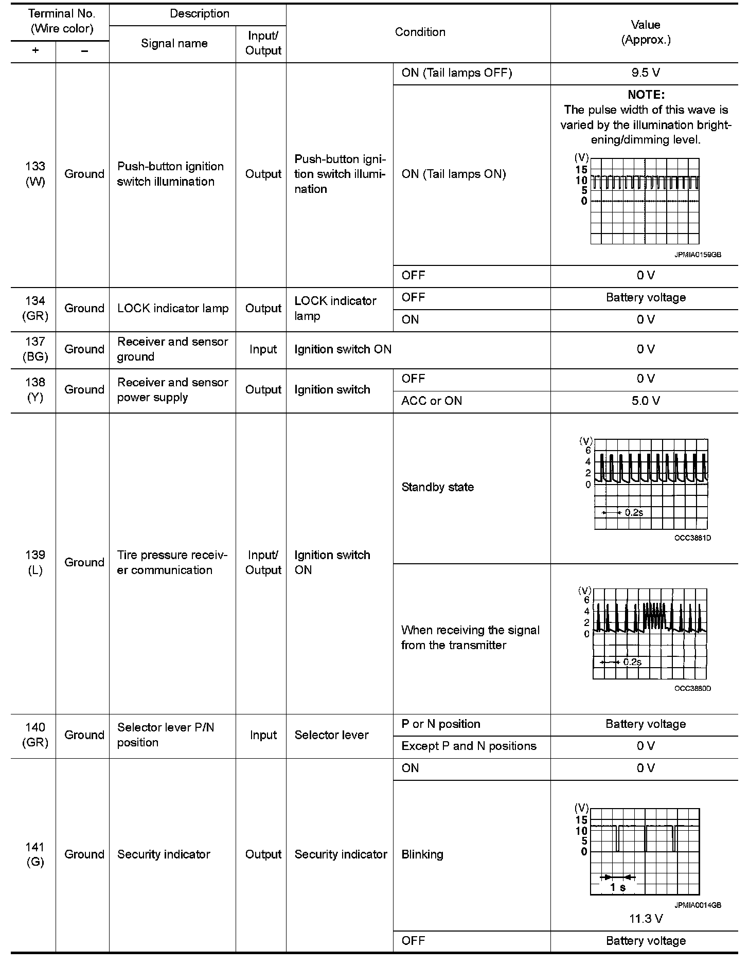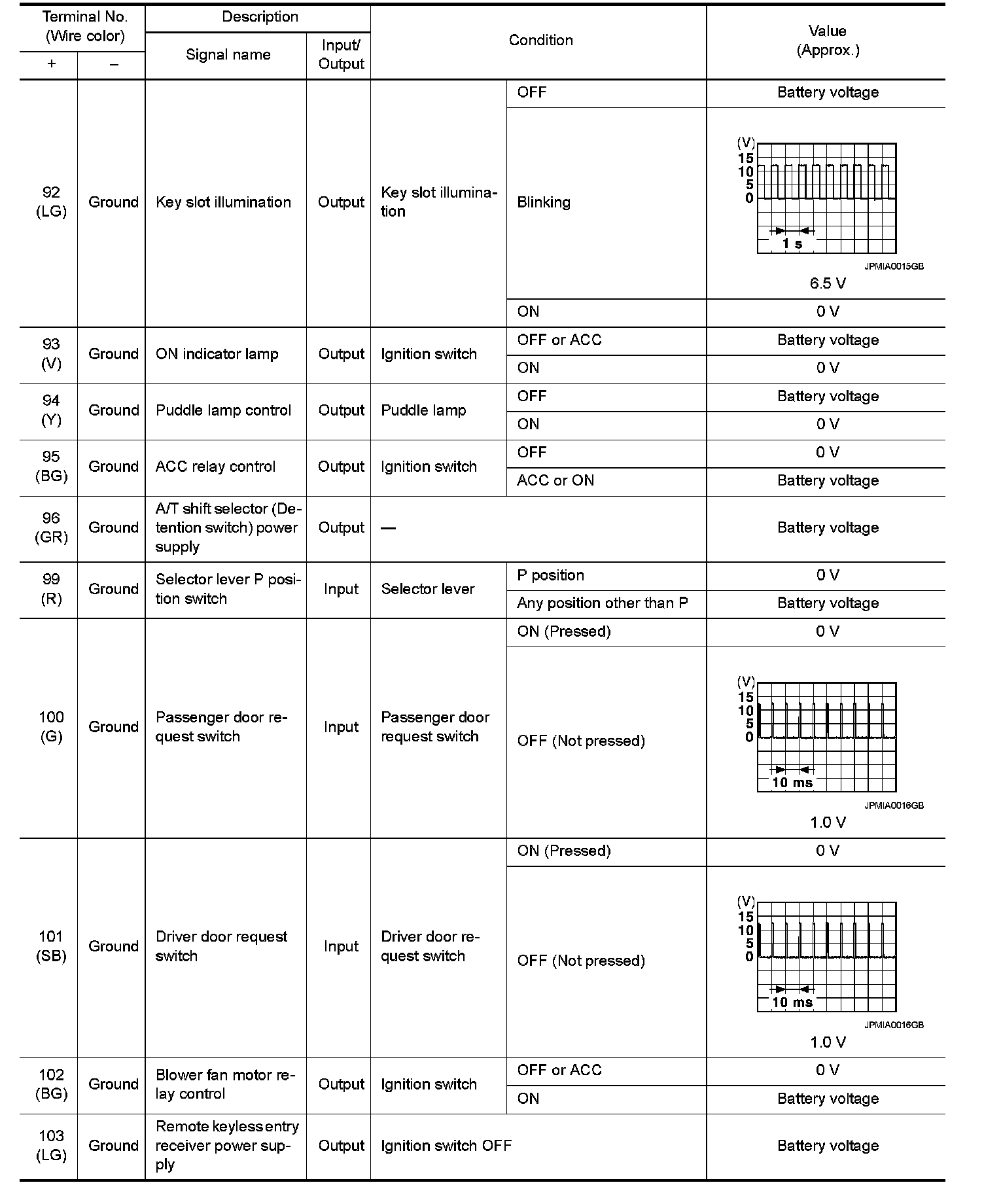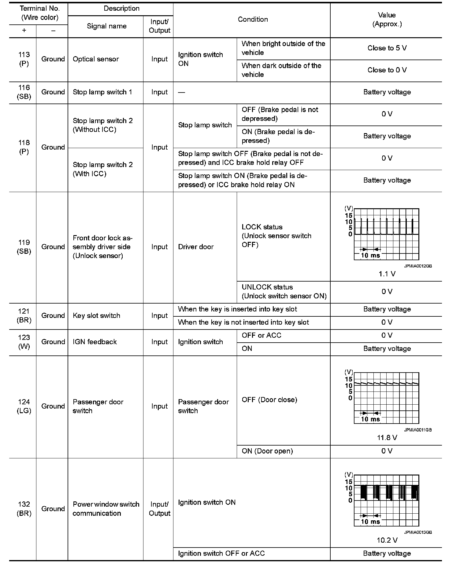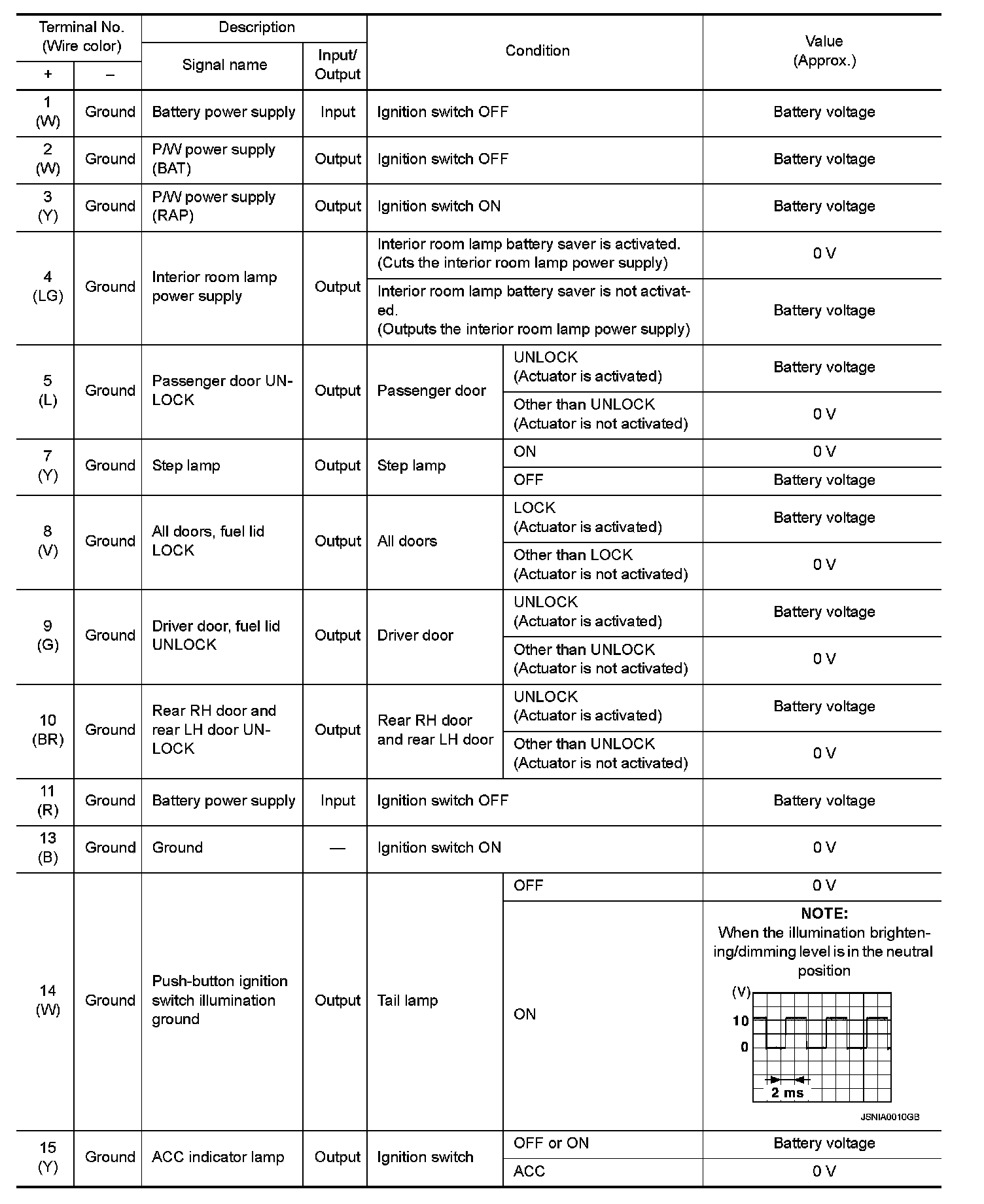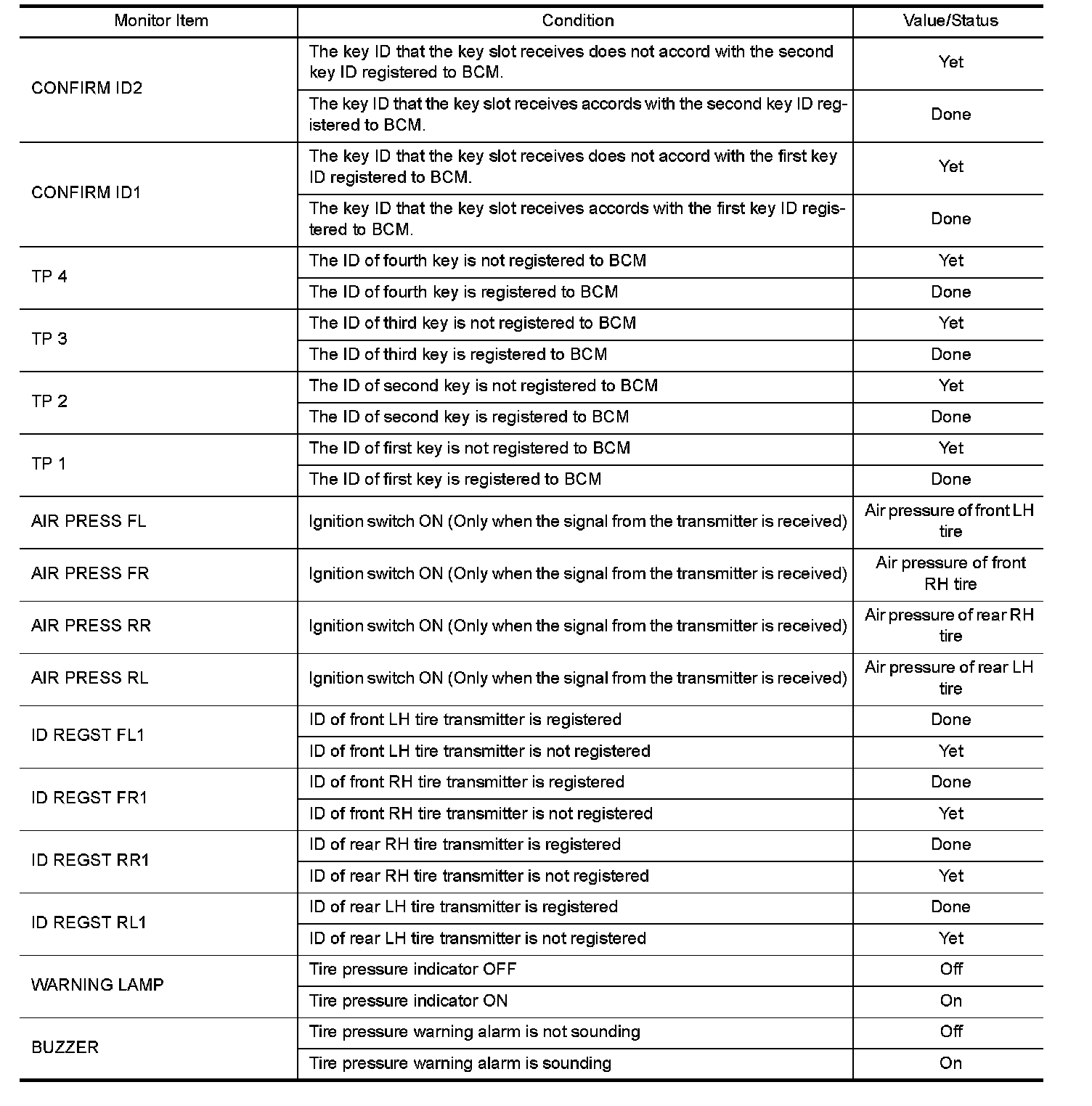 BCM (BODY CONTROL MODULE)Reference Value VALUES ON THE DIAGNOSIS TOOL NOTE: The following table includes information (items) inapplicable to this vehicle. For information (items) applicable to this vehicle, refer to CONSULT display items.