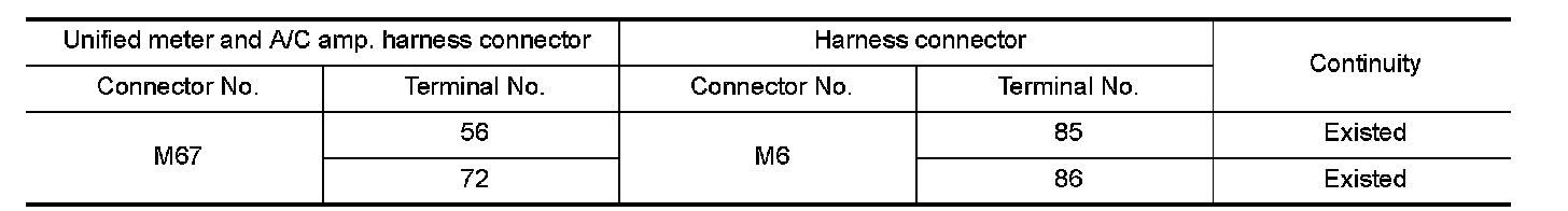 2.Check the continuity between the unified meter and A/C amp. harness connector and the harness connector.