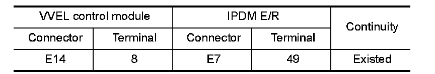 4.Check the continuity between VVEL control module harness connector and IPDM E/R harness connector.