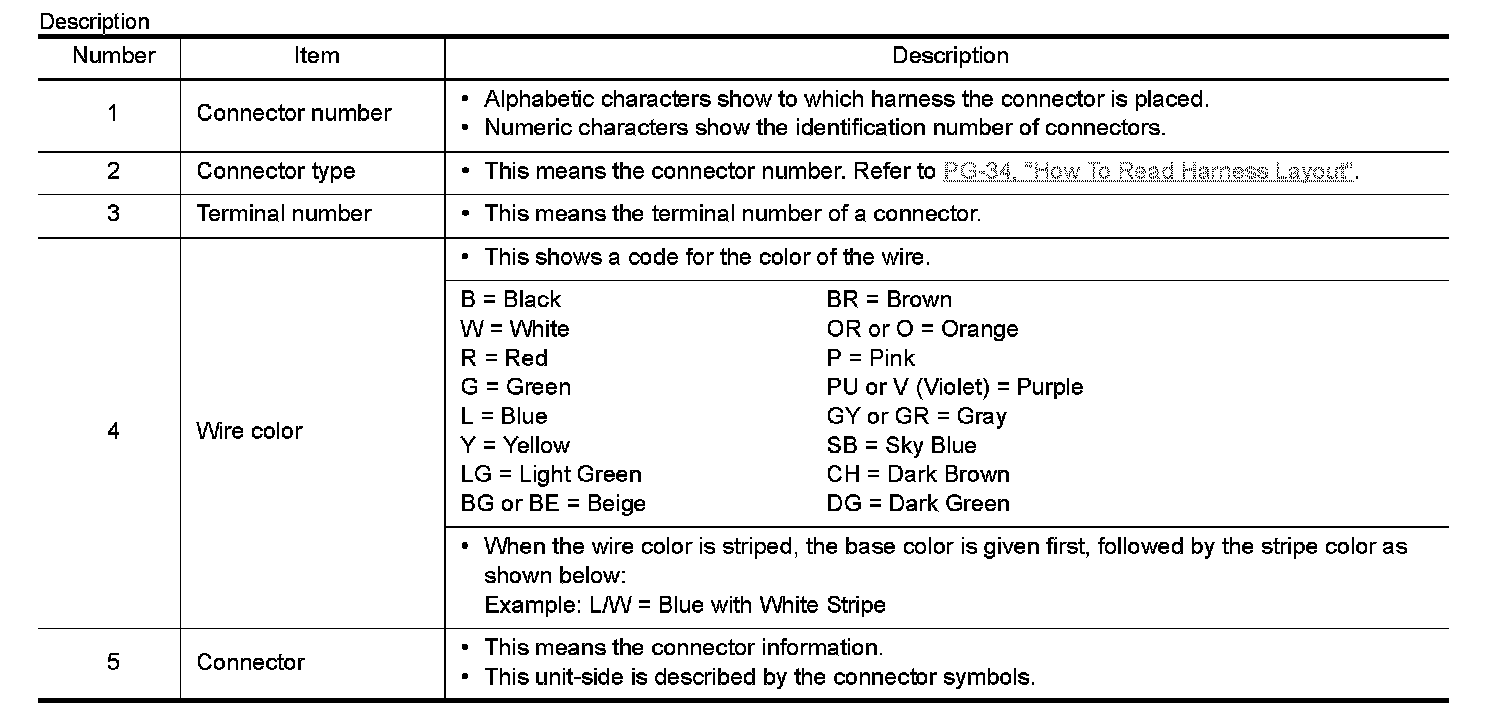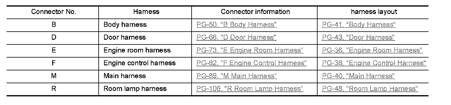 HOW TO READ WIRING DIAGRAMSConnector Information CONNECTOR LIST Connector information and harness layout are described in "POWER SUPPLY, GROUND& CIRCUIT ELEMENTS" Section.