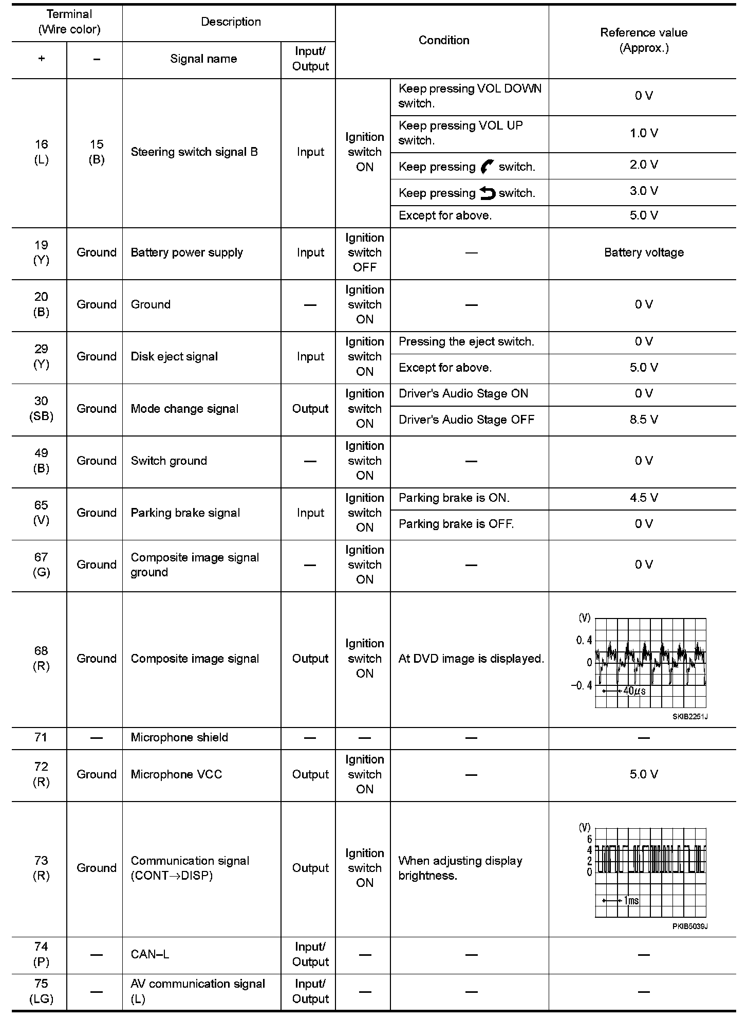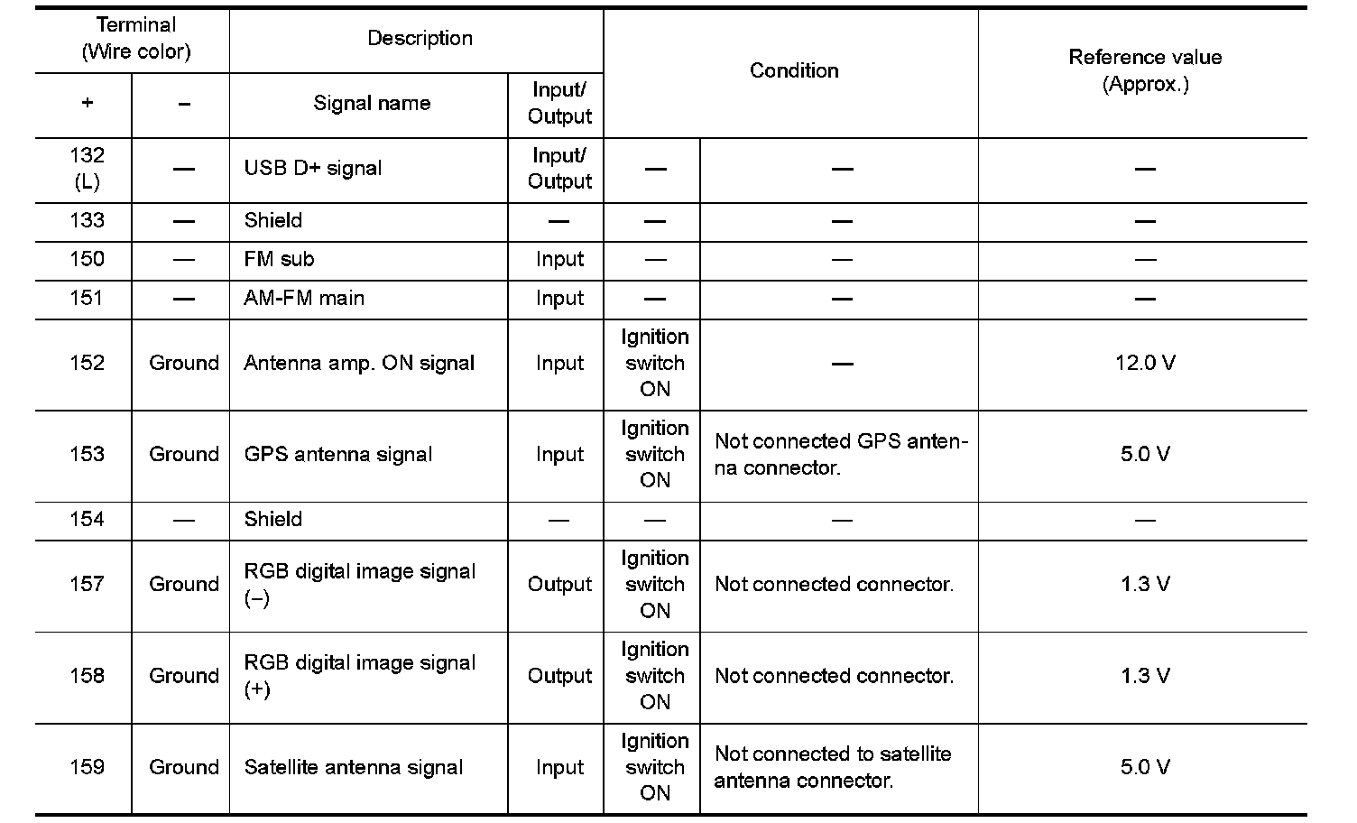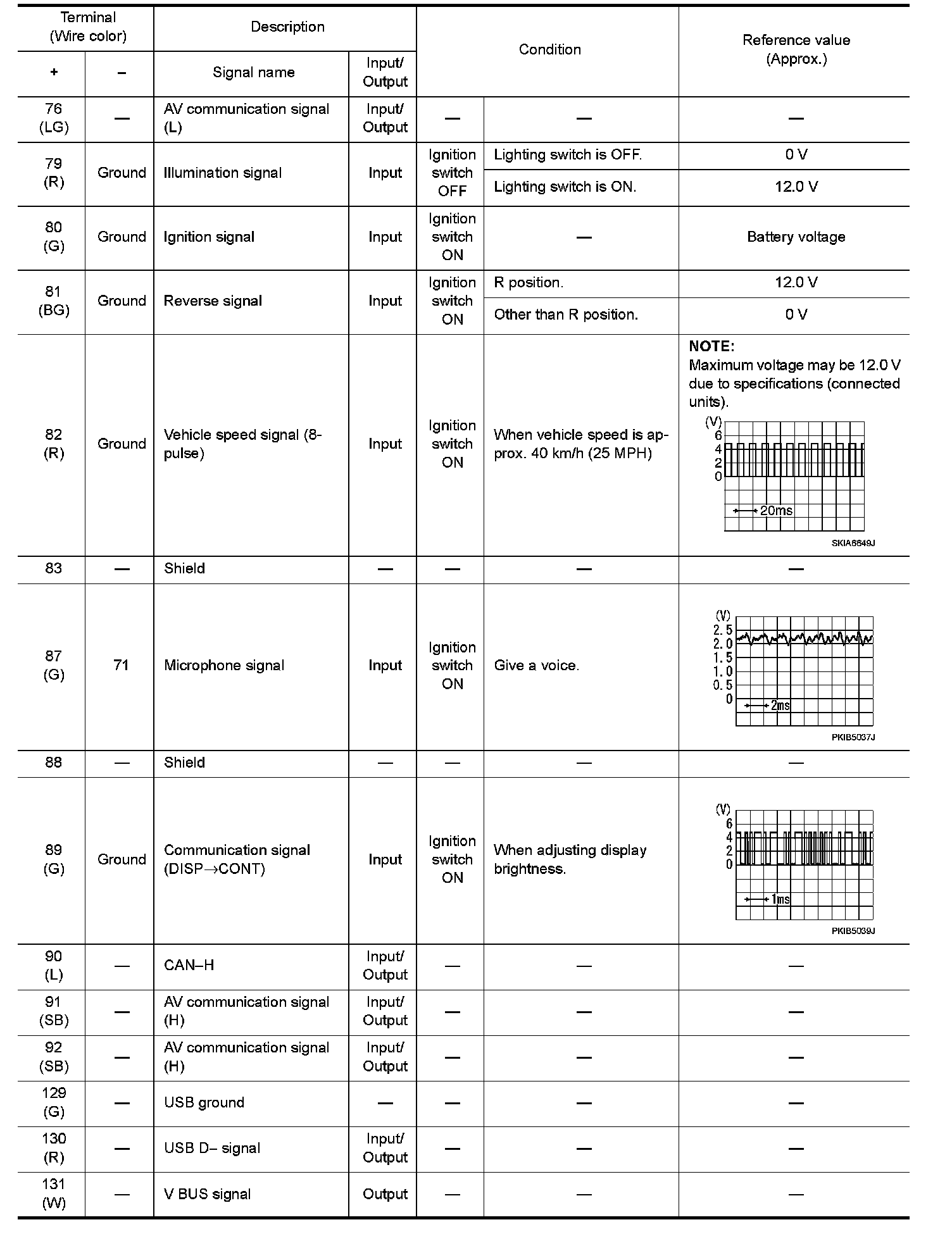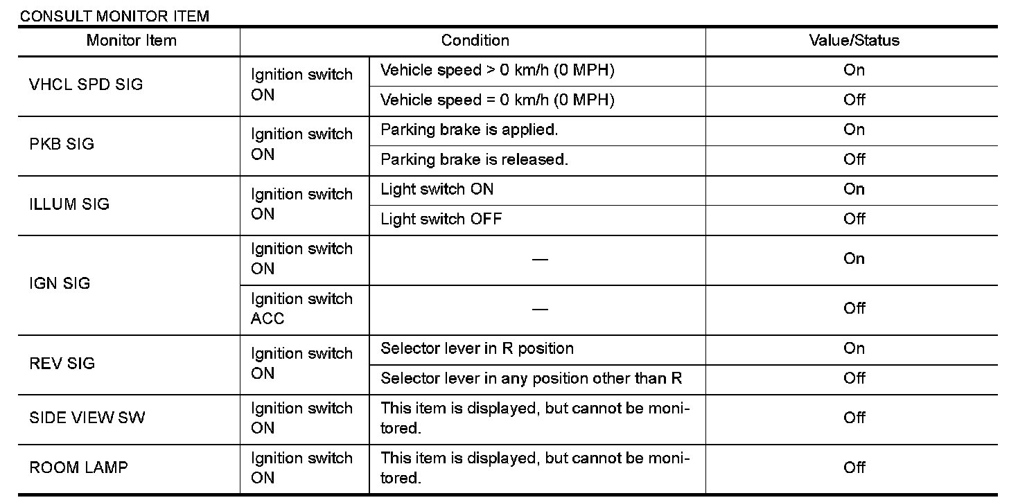 AV CONTROL UNITReference Value VALUES ON THE DIAGNOSIS TOOL NOTE: The following table includes information (items) inapplicable to this vehicle. For information (items) applicable to this vehicle, refer to CONSULT display items.