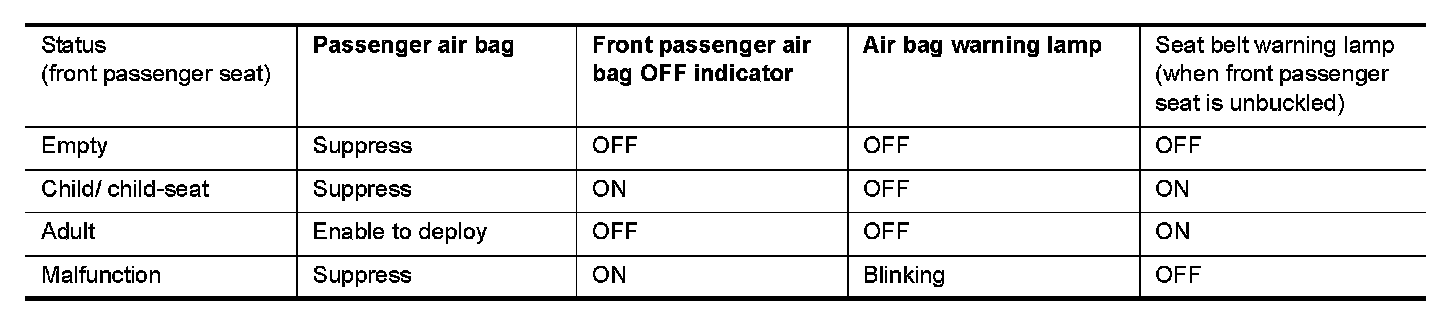 1.Suppress the deployment of front passenger air bag when front passenger seat is empty, or when occupied by child and child-seat. Turns ON front passenger air bag OFF indicator when front passenger seat is occupied by child-seat and child.
