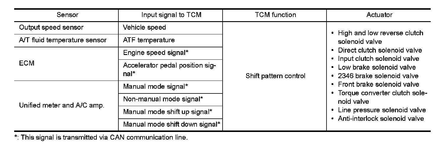 - The TCM receives the manual mode signal, non-manual mode signal, manual mode shift up signal and manual mode shift down signal from unified meter and A/C amp. via CAN communication line. The TCM