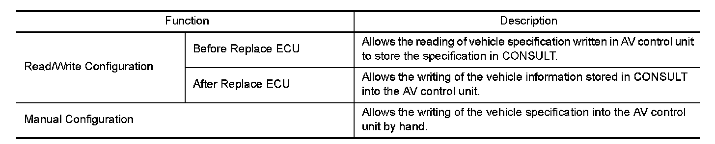 - Since vehicle specifications are not included in the AV control unit after replacement, it is required to write vehicle specifications with CONSULT.