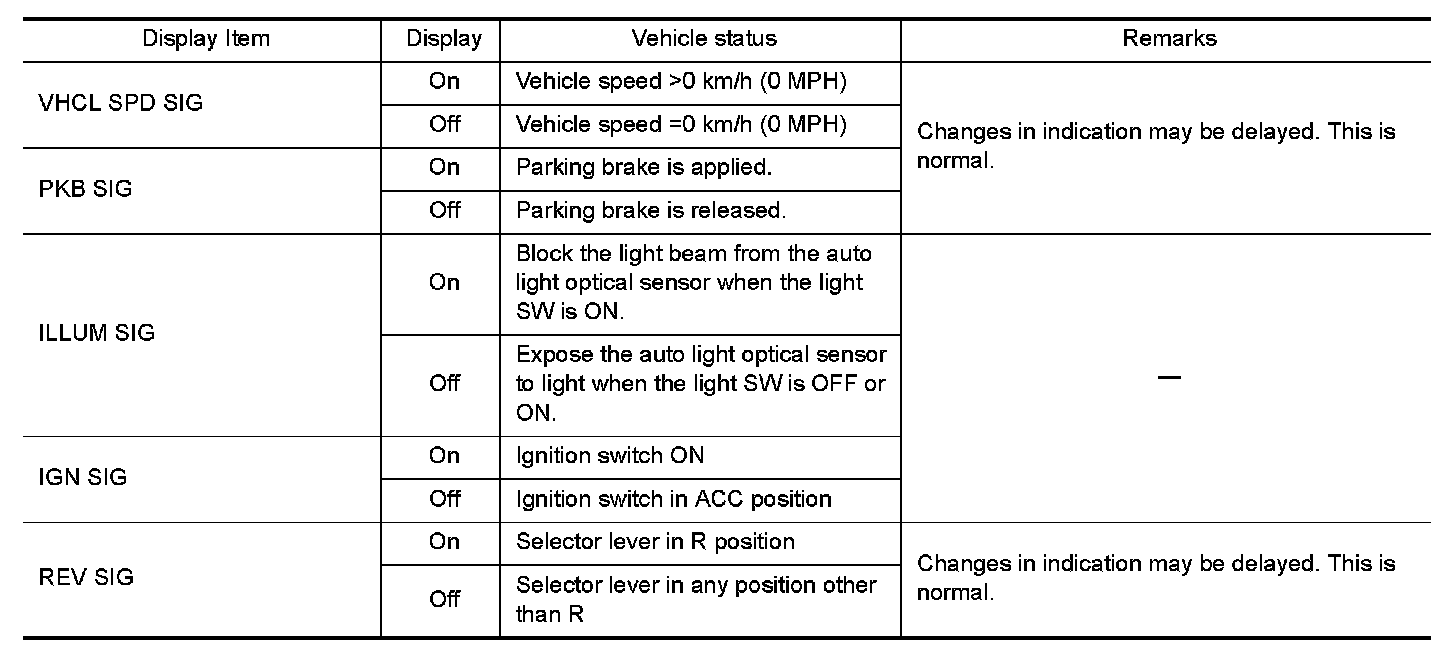 - Displays the status of the following vehicle signals inputted into the AV control unit.