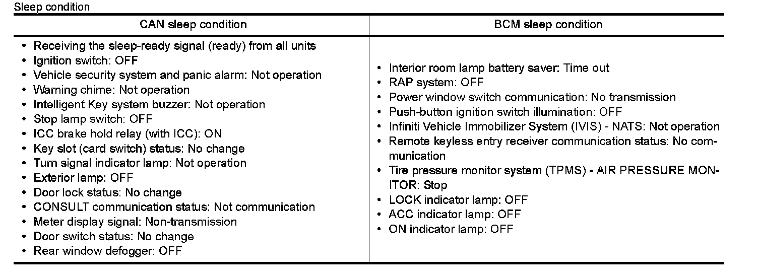 - BCM transmits the sleep wake up signal (sleep) to each unit when all of the CAN sleep conditions are fulfilled.