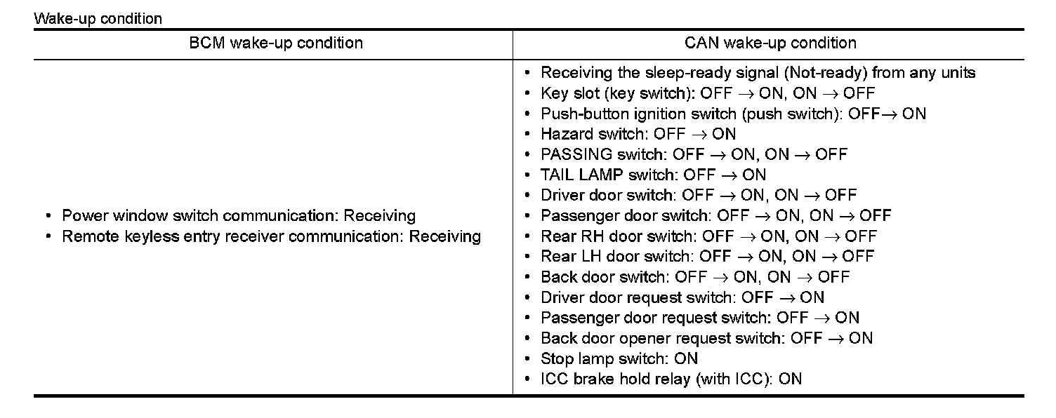 - BCM transmits the sleep wake up signal (wake up) to each unit when any of the CAN wake-up conditions is fulfilled. It changes from the low power consumption mode or the CAN communication sleep mode to the normal mode.