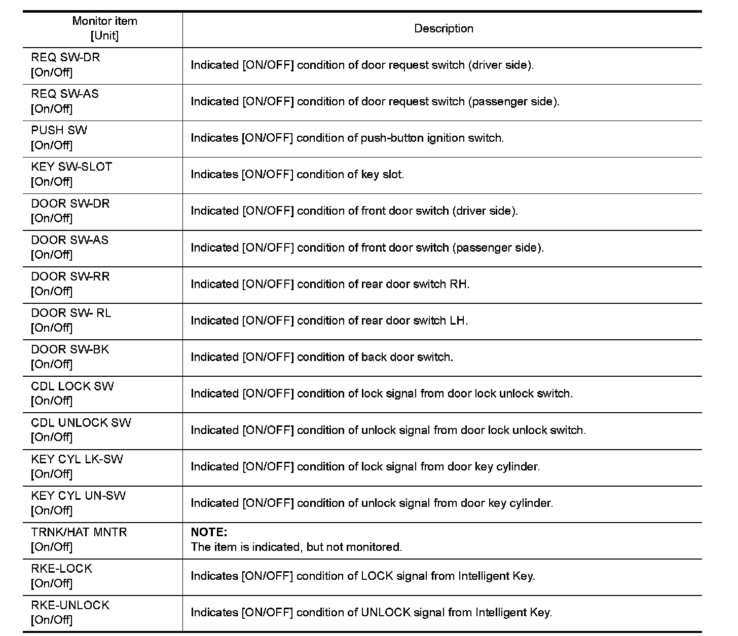The following table includes information (items) inapplicable to this vehicle. For information (items) applicable to this vehicle, refer to CONSULT display items.