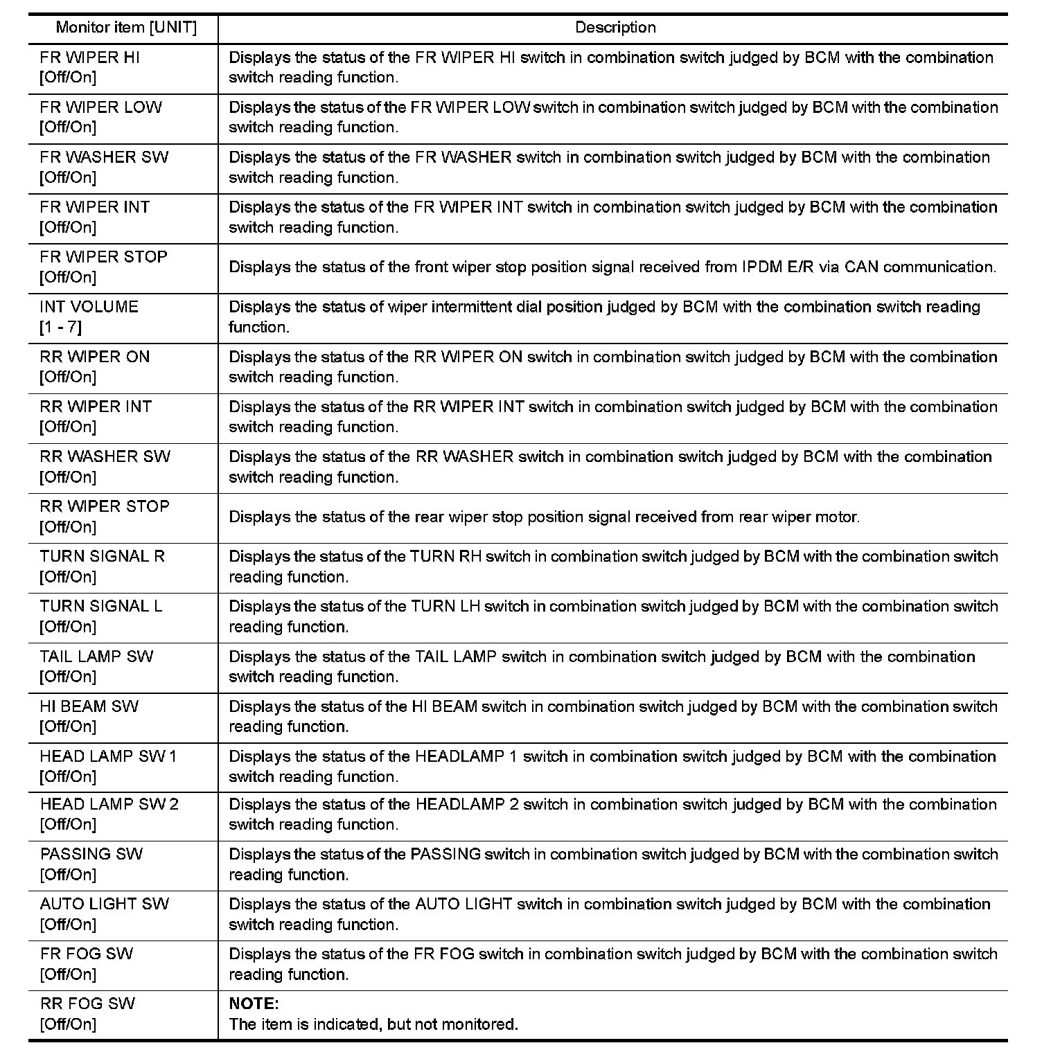 The following table includes information (items) inapplicable to this vehicle. For information (items) applicable to this vehicle, refer to CONSULT display items.