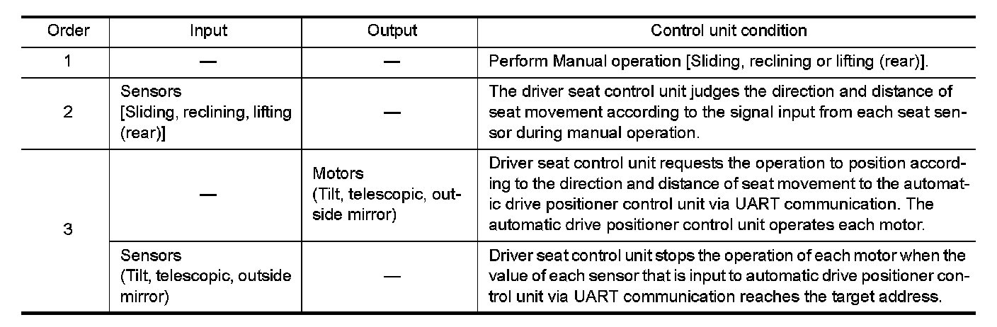 The steering column position and door mirror position is adjusted to the position automatically according to the direction and distance of seat movement when performing the manual operation of sliding, reclining or lifting (rear). This function saves adjusting the mirror and steering column when adjusting the seat.