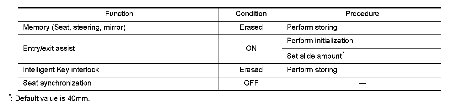 Each function is reset to the following condition when the battery terminal is disconnected.