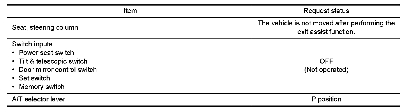 Satisfy all of the following items. The entry assist function is not performed if these items are not satisfied.