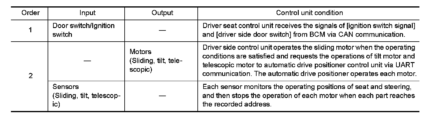 2.Driver seat and steering column will return from the exiting position to entry position.
