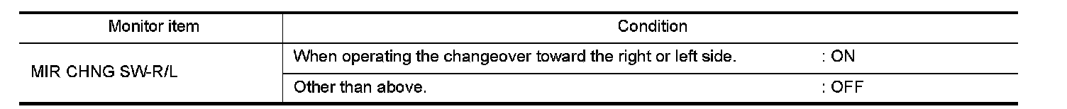 Check the operation on "MIR CHNG SW-R" or "MIR CHNG SW-L" in "DATA MONITOR" mode with CONSULT.