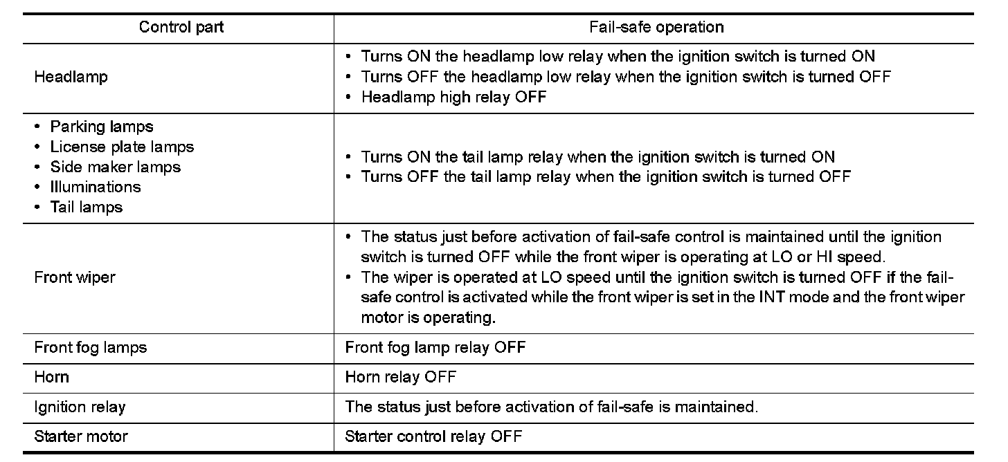 - If the ignition relay cannot turn OFF due to contact seizure, it activates the tail lamp relay for 10 minutes to alert the user to the ignition relay malfunction when the ignition switch is turned OFF.