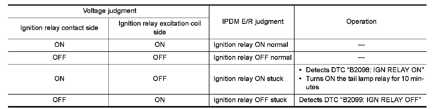 - IPDM E/R judges the ignition relay error if the voltage differs between the contact circuit and the excitation coil circuit.