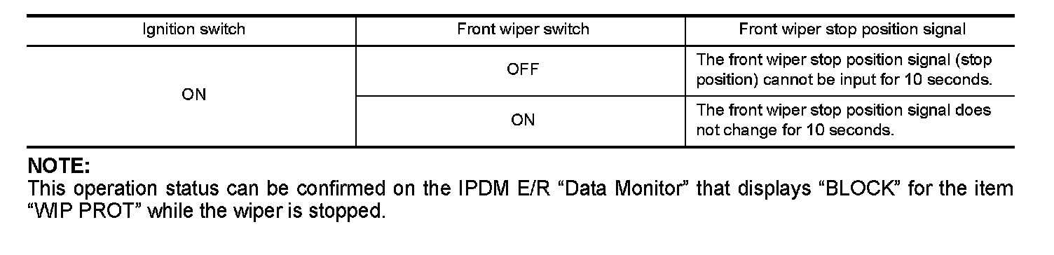 When a front wiper stop position signal is in the conditions listed below, IPDM E/R stops power supply to wiper after repeating a front wiper 10 seconds activation and 20 seconds stop five times.