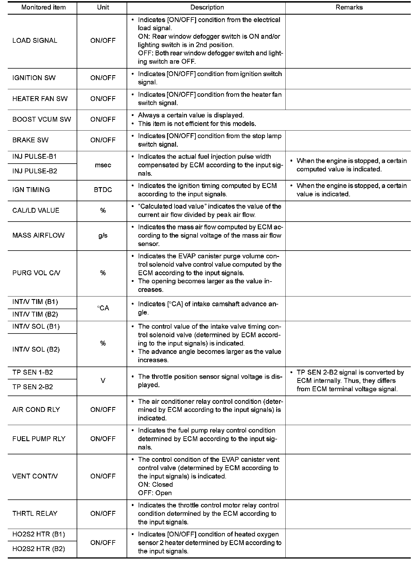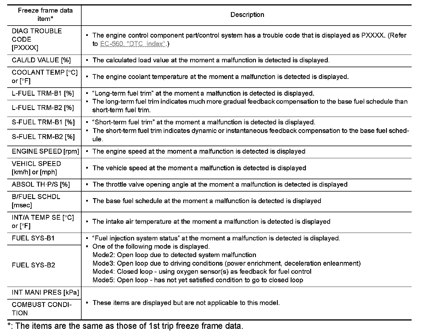 Regarding items of DTC and 1st trip DTC, refer to "DTC Index" Testing and Inspection.