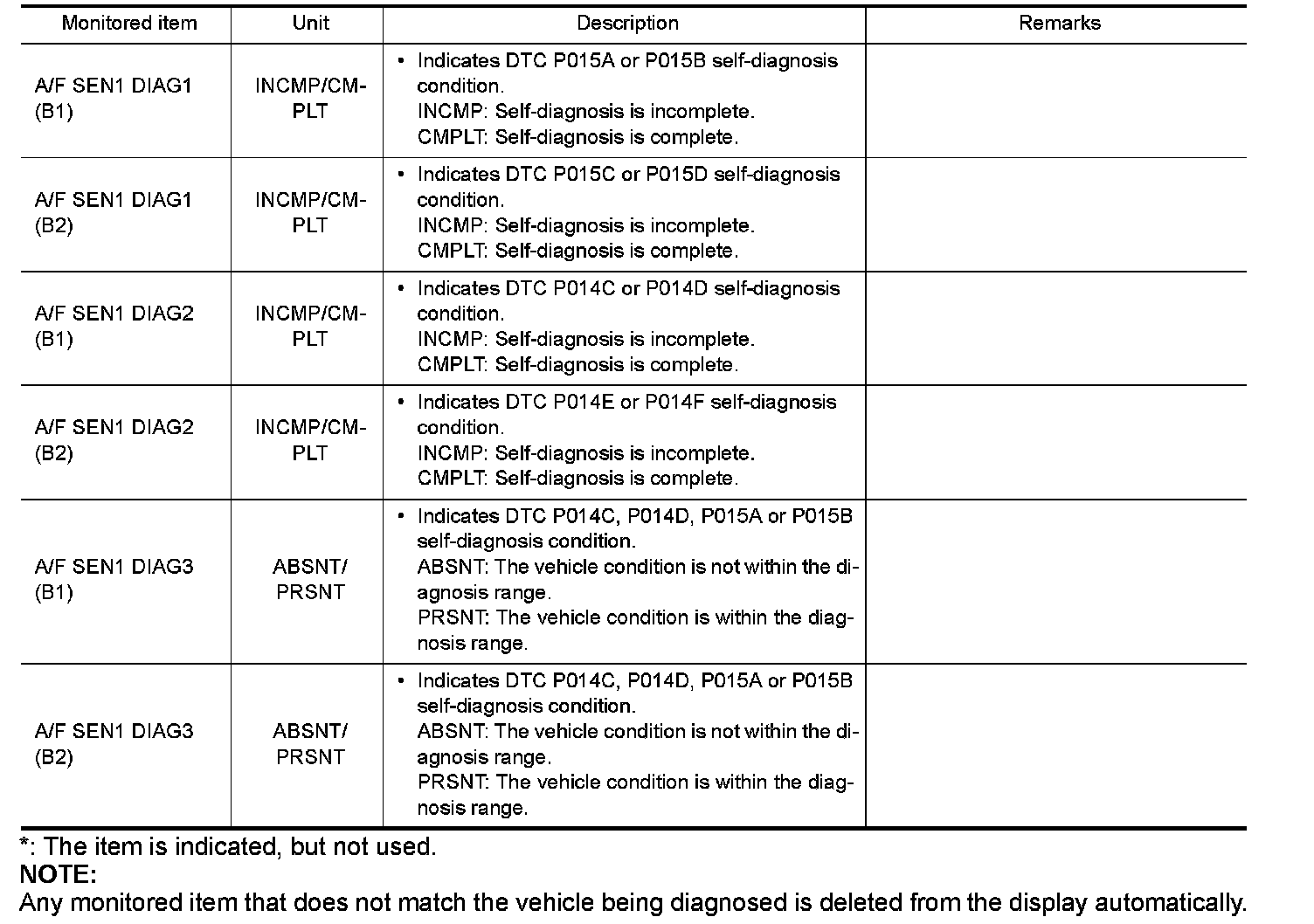 Any monitored item that does not match the vehicle being diagnosed is deleted from the display automatically.