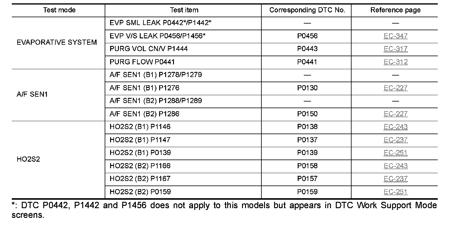 *: DTC P0442, P1442 and P1456 does not apply to this models but appears in DTC Work Support Mode screens.